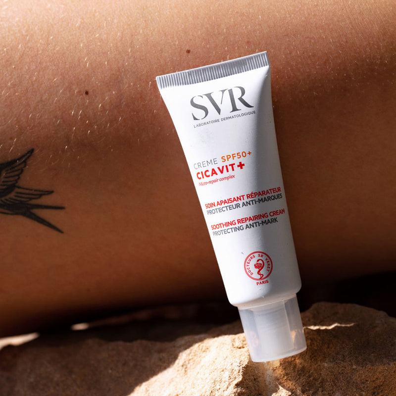 Cicavit+ Crème SPF50+ garantit un été sans marques ! Un soin apaisant intense qui répare 7 fois plus vite. Protège contre les rayons, limite les risques de marques rouges et brunes. Sa texture invisible fusionne avec la peau pour apaiser intensément et accélèrer la réparation cutanée. Résiste à l’eau.