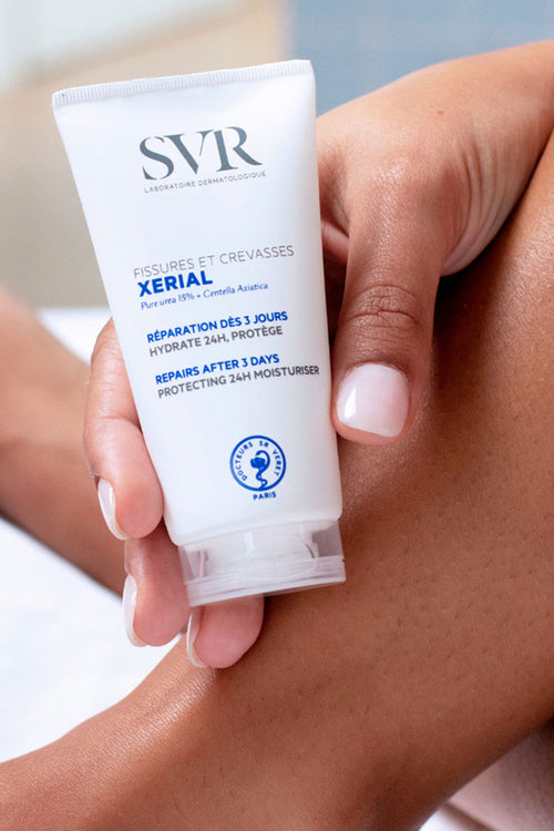 Peaux sèches et squameuses à tendance psoriasique, pieds secs et callosités. Toutes ces problématiques de peaux sont liées à une hyperkeratinisation : votre peau va trop vite et fabrique trop de cellules. Les couches de peaux s’accumulent et forment des plaques, des bouchons (kératoses pilaires) et de la corne. Xerial lisse et limite la prolifération des kératinocytes grâce à des formules très concentrées en urée, de 5% à 50% selon la problématique de peau. Convient aux peaux sensibles. 💙